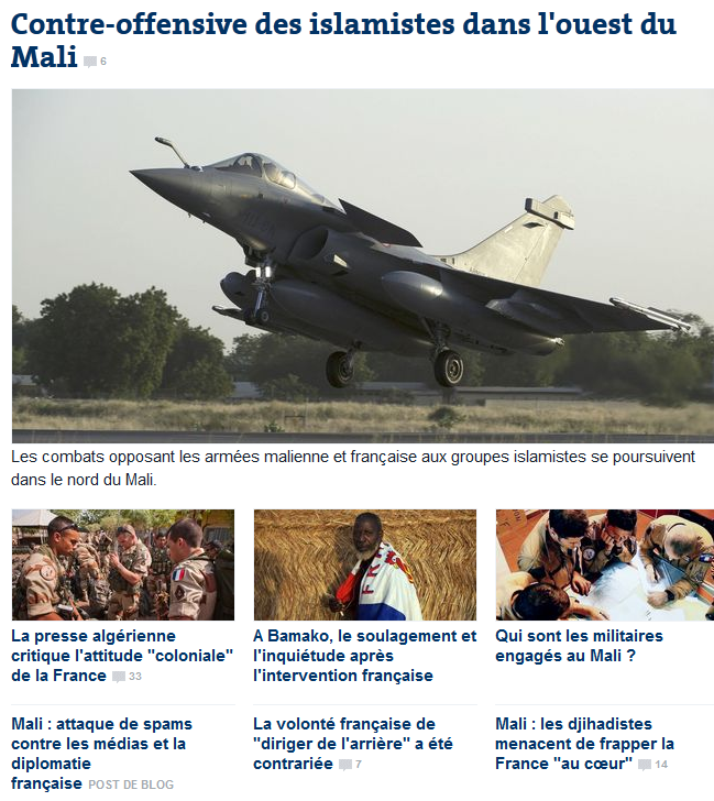 The news out of Paris is all about Mali, as evidenced by this screenshot from LeMonde. That’s because last week France sent troops to fight rebels who’ve held the north for months. It did so on request of the government that still holds power in the southern region where Mali’s capital, Bamako, is located. (The BBC reported that other countries, in the West and in Africa, are lending support to the French efforts, while a New York Times article contended that U.S. missteps helped fuel the crisis.)