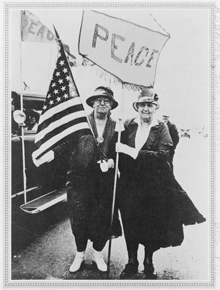 Another was Jane Addams (below), who lectured for peace and against war, and led the U.S.-based Women’s Peace Party. In 1915, Addams chaired the International Congress of Women at The Hague and became the founding President of the Women’s International League for Peace and Freedom, an organization that thrives to this day. For her efforts Addams eventually would receive the Nobel Peace Pr