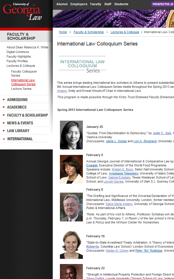 The adventure was the Georgia Law International Law Colloquium, founded 8 years ago and still going strong. This was the 1st year I served as series coordinator, bringing here to Athens 8 scholars whom my colleagues, Harlan Cohen, Lori Ringhand, Bo Rutledge, and Tim Meyer, helped me select. As the roster indicates, we welcomed scholars who work overseas as well as Stateside. Their works in progress spanned many subfields of international law law, from comparative constitutionalism to human rights and migration, from investment arbitration and intellectual property to targeting of military objectives. We got sneak peeks of some nearly finished writings, such as an excerpt from Bill Schabas’ new 3-volume work on the Universal Declaration of Human Rights and Leila Sadat’s forthcoming American Journal of International Law article on crimes against humanity, as well as looks at works still in their formative stages. We enjoyed spirited conversations among scholars, discussants, and students.