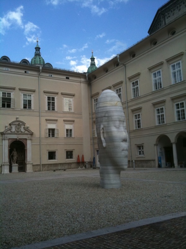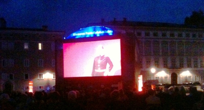 display throughout the baroque Altstadt. Concerts and opera, not to mention sculptures, paintings, and plays, filled indoor venues and outdoor squares – all part of the Salzburg Festival that runs through September 1. Though unschooled in opera, I was tempted to plunk down the considerable cost of a ticket to see Zubin Mehta conduct Verdi’s Falstaff just blocks away from Mozart’s birthplace. But then my colleagues William Schabas and Roger Clark, also there to teach at the summer school, alerted me to a more affordable option: an al fresco meal in front of a free Jumbotron broadcast of a 2004 Festival production of Strauss’ Der Rosenkavalier.