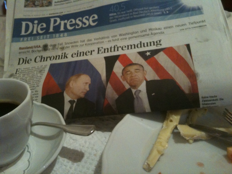 household intimacy, the media made much of the Entfremdung, or estrangement, between Vladimir Putin and Barack Obama, leaders of the countries that from the late ’40s through the late ’80s waged a Cold War (a period of conflict during which Austria had remained decidedly neutral). The paper’s account of sticking points between the 2 powers – nuclear disarmament; Snowden and spying; Syria; LGBT rights and the rights of dissidents like Magnitsky – made for quite a long détente to-do list.