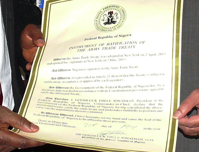 Nigeria joins Antigua and Barbuda, Guyana, and Iceland as an early ratifier of the Arms Trade Treaty.