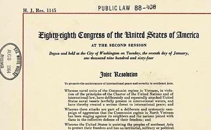 ► Interventions conducted pursuant to the 1964 Gulf of Tonkin Resolution (right) that led to escalation of the U.S.-Vietnam War, the 2001 post-9/11 authorization that preceded the U.S.-led counterassault in Afghanistan, and the 2002 authorization to use force in Iraq.