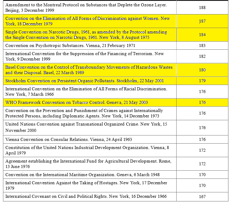 Notably, the United States is a full member of all the U.N. treaties just named. Indeed, it belongs to 23 of the 36 treaties on the U.N. list, including nearly all that are intended to step up the enforcement of criminal law. That said, many of the 13 treaties from which it’s steered clear – highlighted in yellow below – are aimed at significant issues, ranging from protection of human rights to protection of health and the environment to protection of global security. They include 2 treaties for which the United States is a nonparty along with only 1 or 2 other U.N. member states; to be precise, the 1989 Convention on the Rights of the Child and the 1992 Convention on Biological Diversity. Here’s the “outlier” list in full: