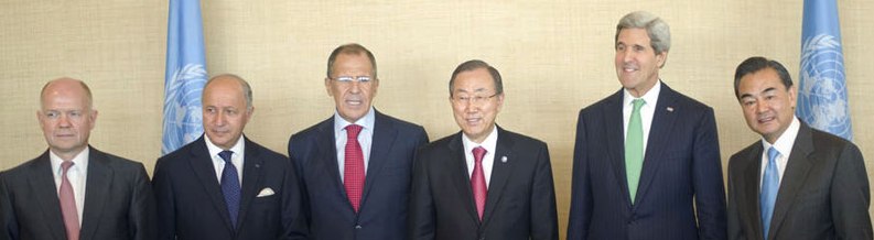 (credit for September 2013 U.N. photo by Mark Garten of, from left, British Foreign Secretary William Hague, French Foreign Minister Laurent Fabius, Russian Foreign Minister Sergey Lavrov, U.N. Secretary-General Ban Ki-moon, U.S. Secretary of State John Kerry, and Chinese Foreign Minister Wang Yi)
