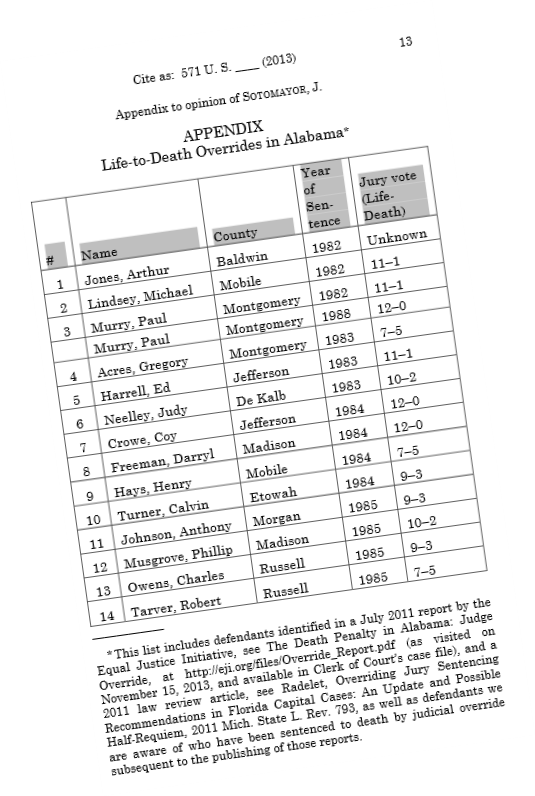 Supporting that conclusion was evidence in the Woodward record of state judges’ admissions that re-election worries may have motivated them to override jurors who, after balancing mitigating and aggravating circumstances, had voted for life imprisonment and against capital punishment. Fully 95 Alabama defendants have received death sentences in such a way, wrote Sotomayor, appending the list of those defendants to her opinion. In the last 13 years, “there have been only 27 life-to-death overrides, 26 of which were by Alabama judges,” Sotomayor added, commenting: