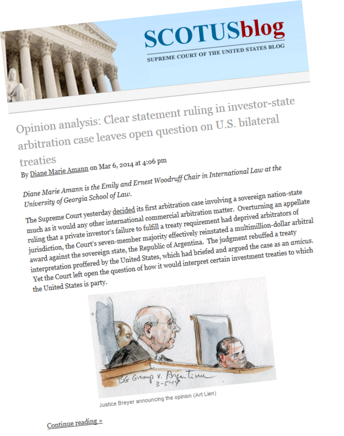 In its first-ever case involving investor-state arbitration, the U.S. Supreme Court yesterday ruled against the state. The state at bar was the Republic of Argentina, which had sought to defend the reversal below of a 2007 decision in which a 3-member arbitral panel awarded $185 million in damages. But in its decision in BG Group plc v. Republic of Argentina, the high court overturned the appellate decision. A seven-member majority accepted the argument of petitioner, a British company that had suffered losses on a Buenos Aires investment as a result of emergency measures Argentina took during an early 2000s economic collapse. The private investor had sought arbitration without first fulfilling a requirement, found in Article 8(2)(a) of the 1990 Britain-Argentina BIT, the insiders’ shorthand for “bilateral investment treaty.” Arbitrators excused that nonfulfillment, and the Court majority deferred to the arbitrators. In so doing, it rejected the de novo review applied by the court below and urged by Argentina.