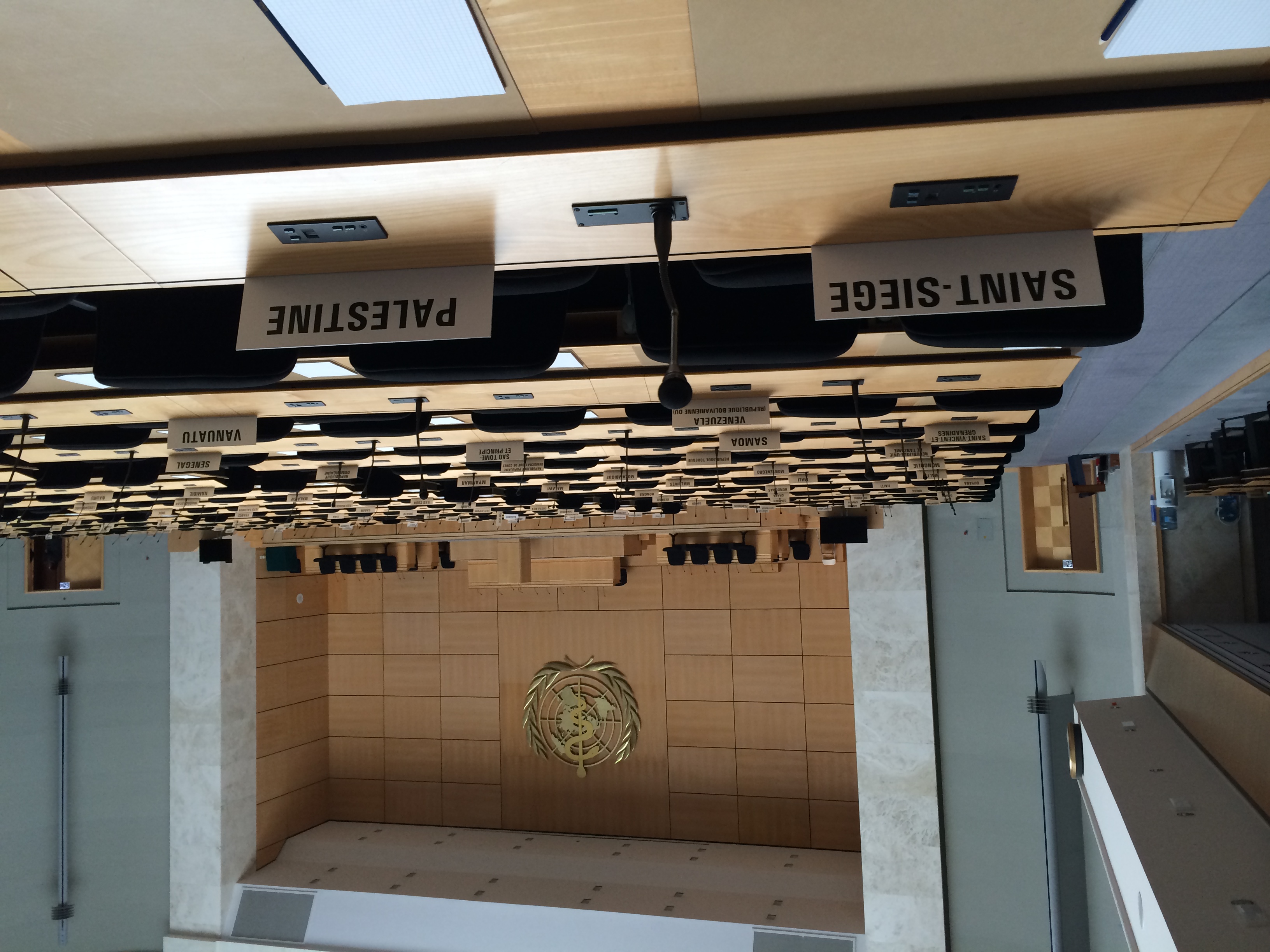 The final set of signs, below, were found in a grand assembly room of the U.N. Geneva building. Organizers were preparing for a large gathering related to the World Health Organization – hence the caduceus affixed to the golden U.N. emblem above the dais. But the most interesting signs are those in the foreground. It had not occurred to me that the 2 entities recognized as U.N. nonmember states would be so situated at such meetings. Not the least because of the imminent journey of Pope Francis to the Middle East, the notion of delegates from entities as different as the Holy See and Palestine sitting side by side both comforts and fascinates.
